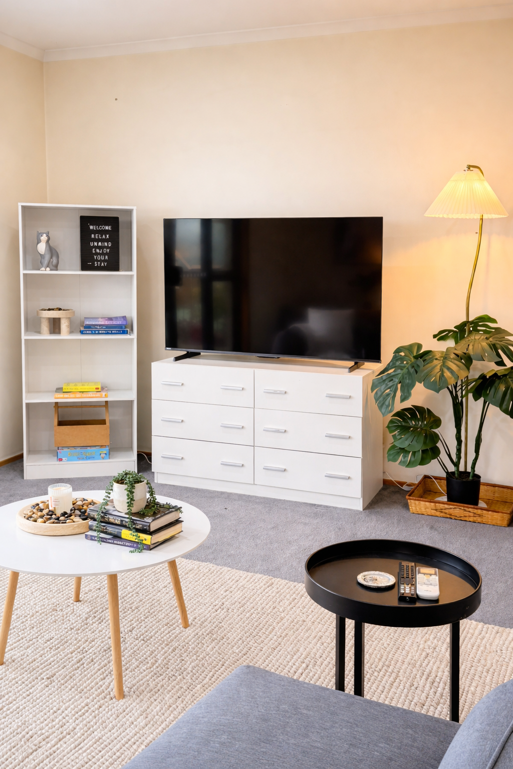 Bright lounge area designed for unwinding, movie nights, and time together.